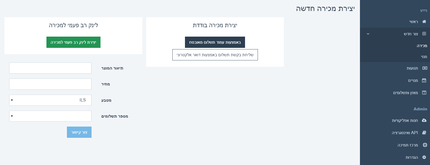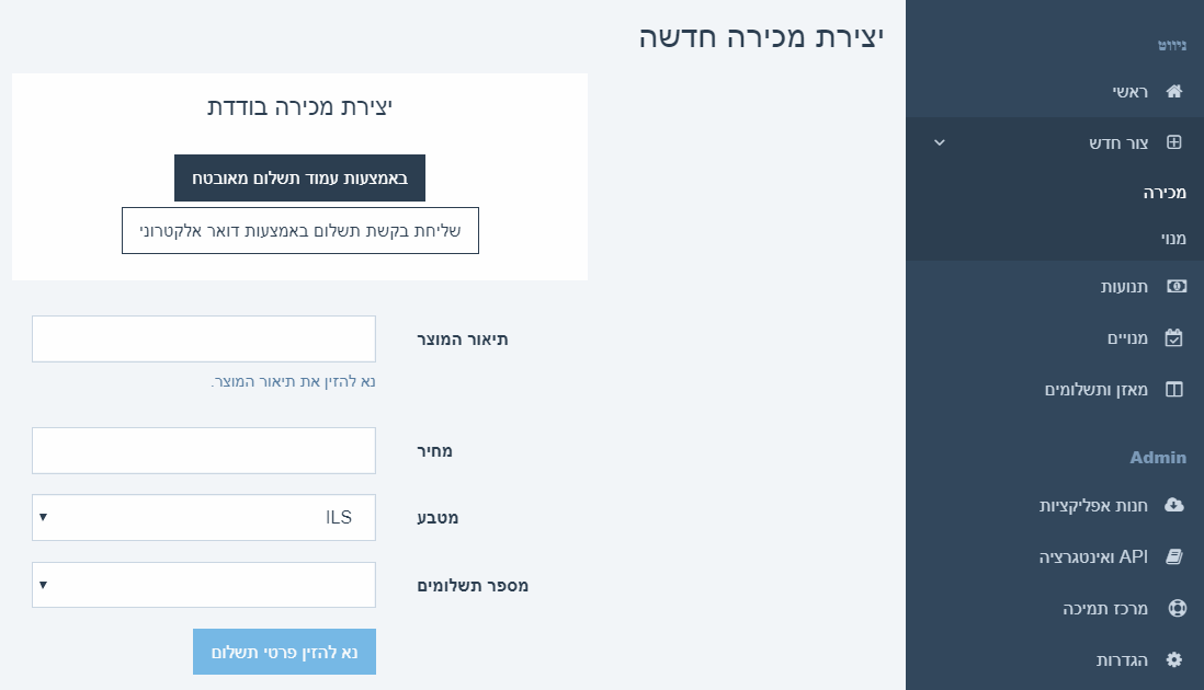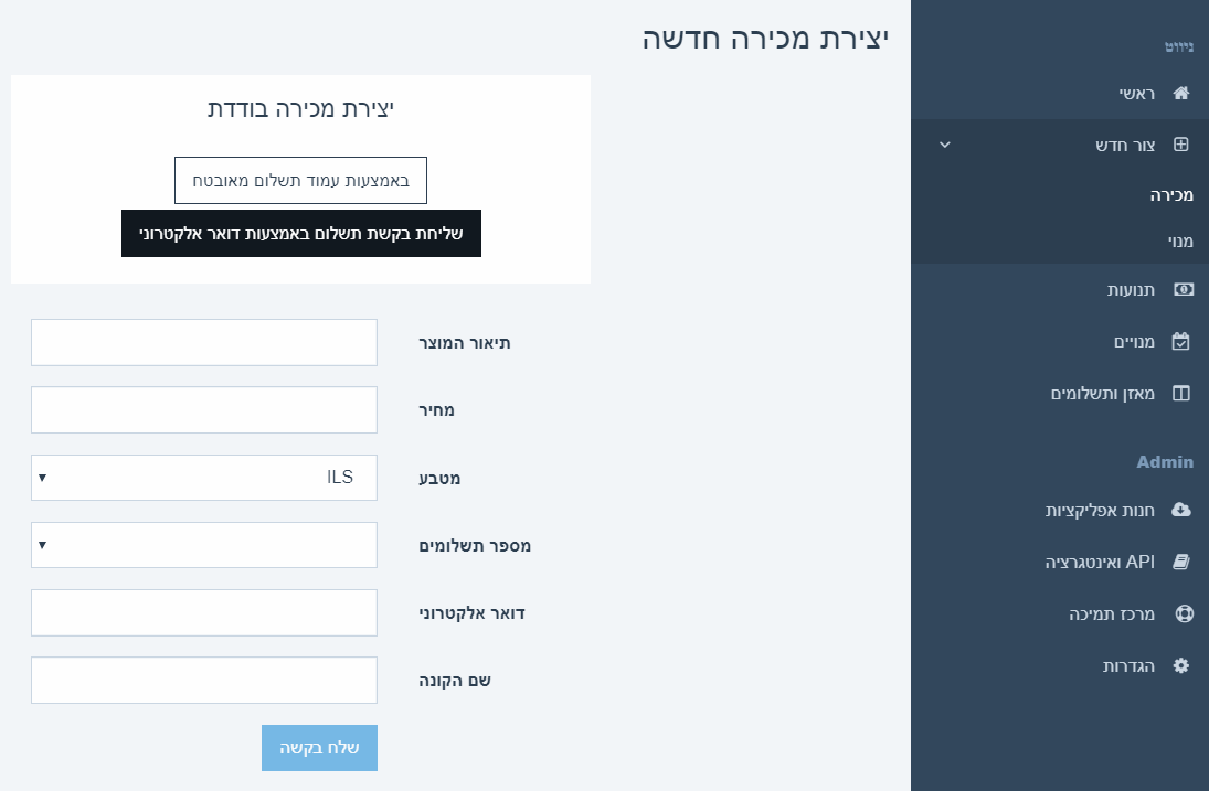 1. יצירת מכירה באמצעות עמוד תשלום מאובטח - מלאו את הפרטים והשלימה את המכירה באופן מידי.